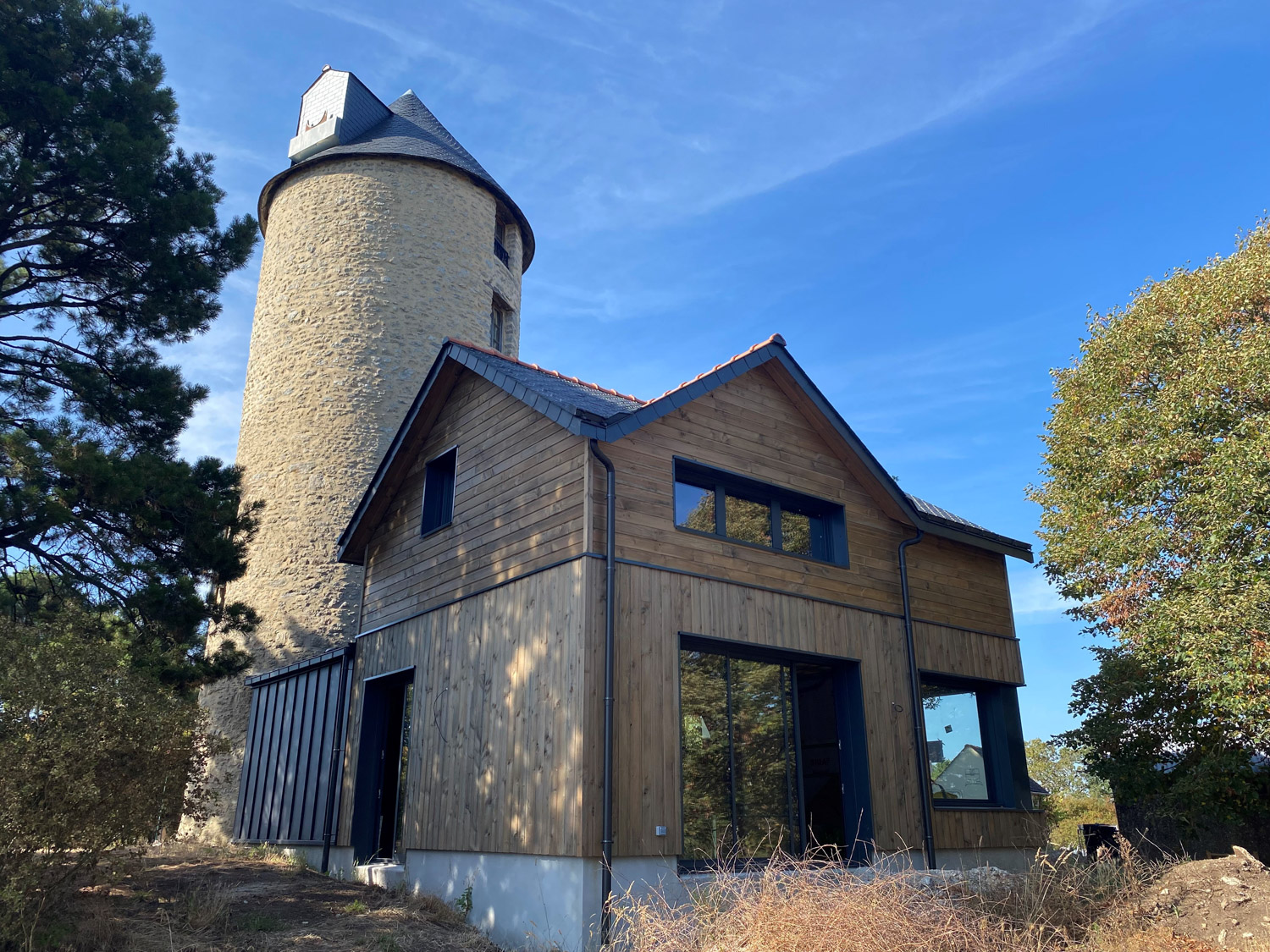 Cet ancien moulin a été transformé en maison d’habitation grâce à l’extension que nous avons réalisée sur 3 niveaux. Les poses horizontales et verticales du bardage bois viennent adoucir les volumes. De plus la mixité de la finition avec le zinc et les finitions aluminiums apporte de la modernité à cette bâtisse exceptionnelle et atypique.