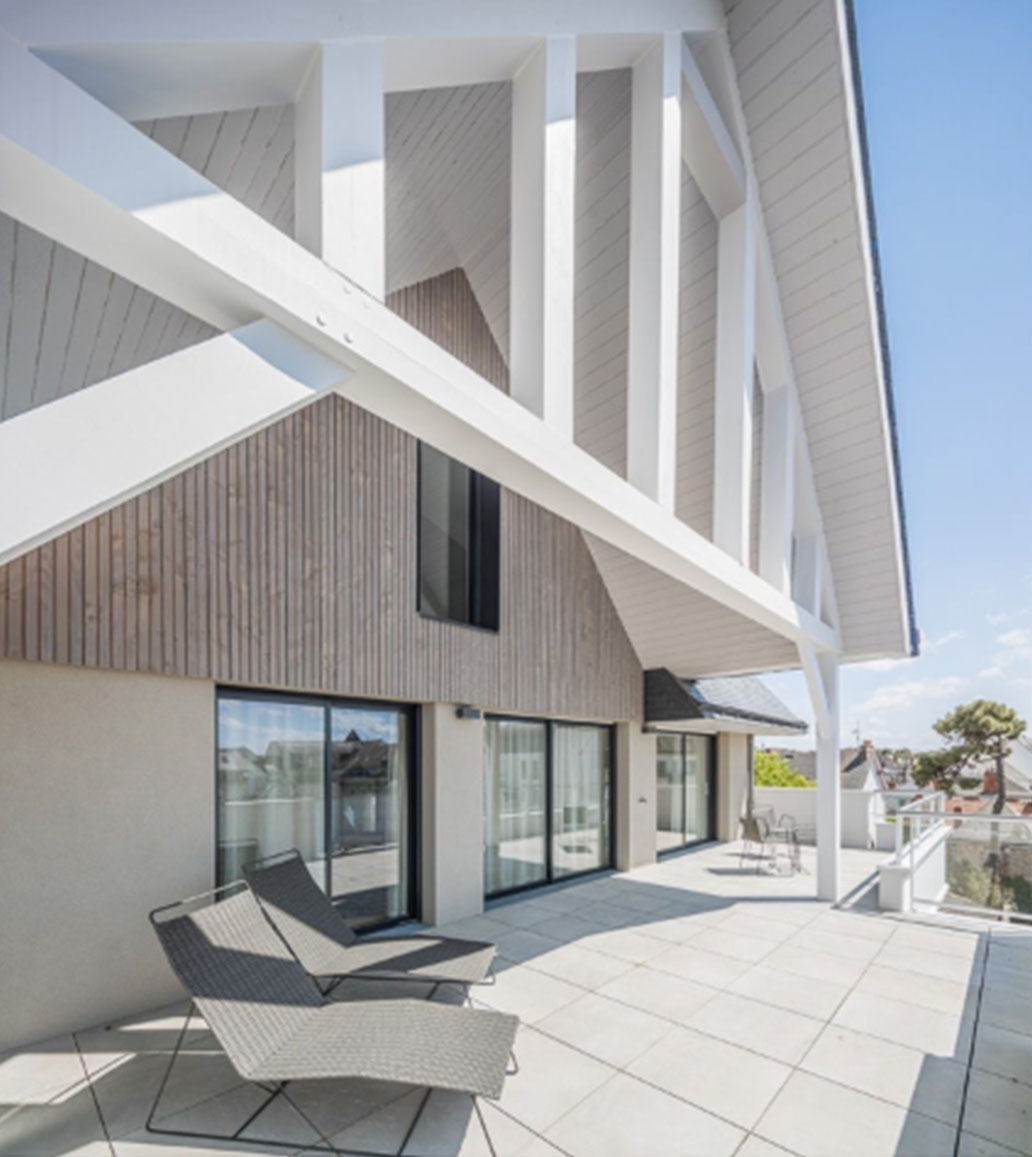 L’extension de cette villa a permis la création d’une grande terrasse permettant aux propriétaires de profiter de la vue dégagée. L’allongement de la couverture et de la charpente apportent du cachet à cette belle maison bauloise.