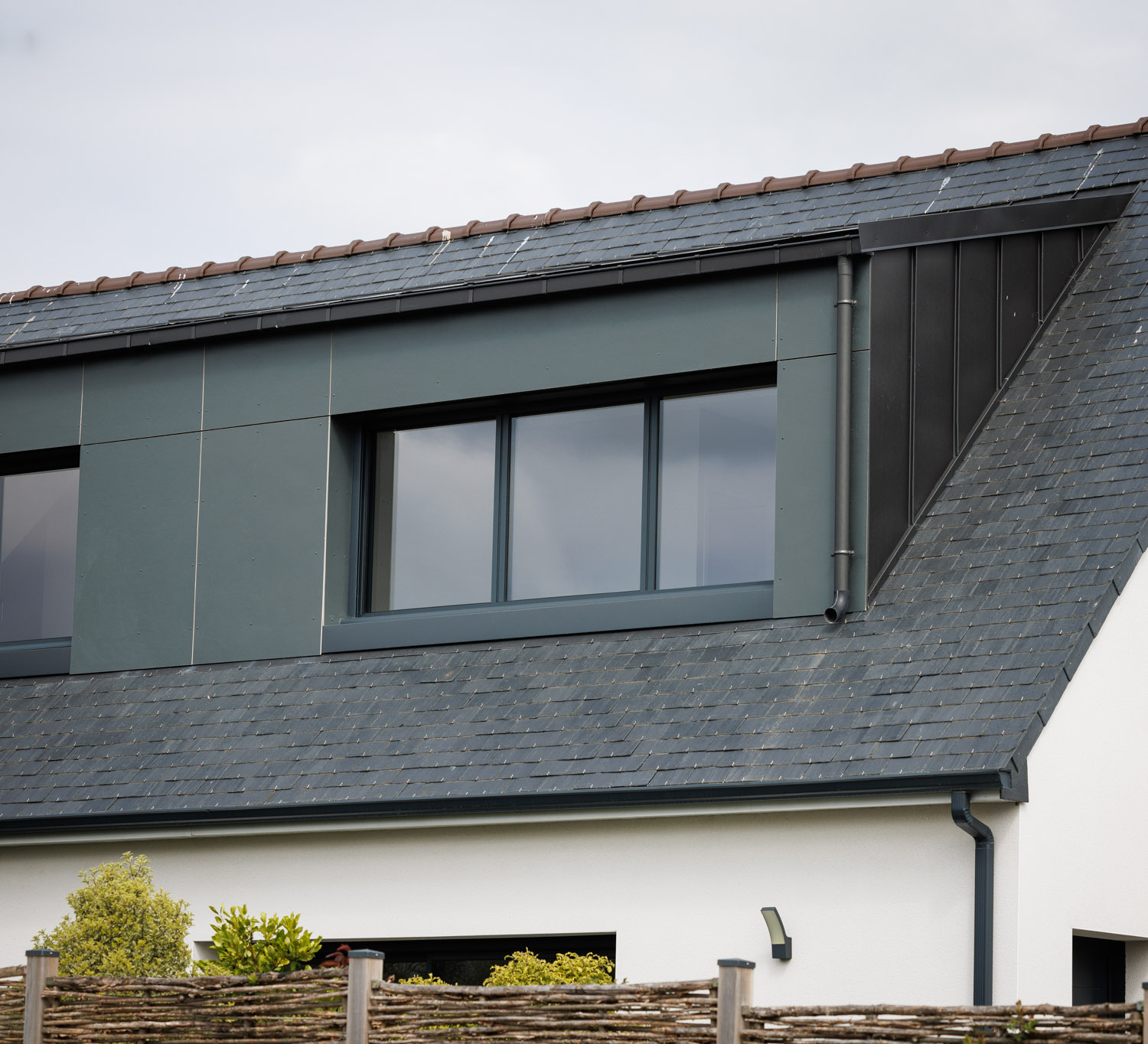 Le bardage a été réalisé à partir de plaques de résine compressées. La couverture est en PLX dont la couleur rappelle celle des ardoises.